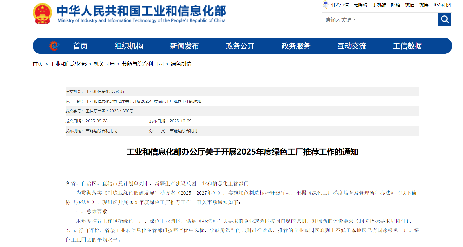 工业和信息化部办公厅关于开展2025年度绿色工厂推荐工作的通知